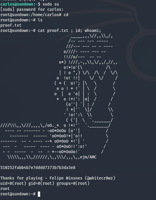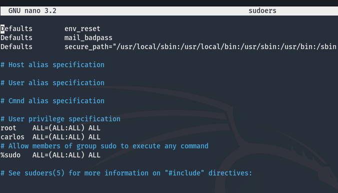 but that is too easy, so to give it a small twist (and to not publish my IP to the victim 😮) , I create a sudoers file in the carlos home folder but I give carlos SUDO permissions: