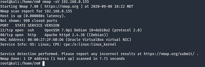 Now that we have the target identified, we’ll proceed to enumerate the services running on it via nmap: