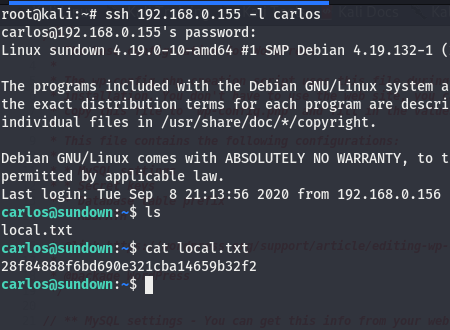 We know there is a carlos user that we could attempt via SSH, I try using the db password and it didn’t work, I then tried carlos/carlos and that worked!