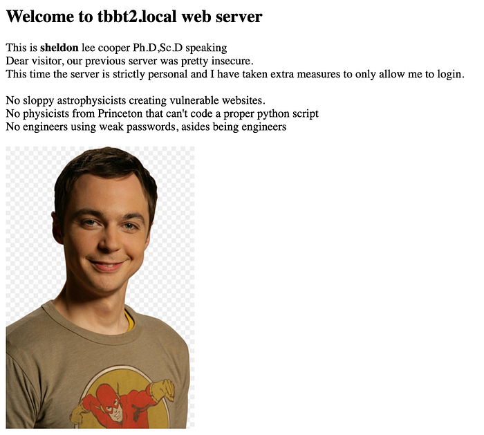|___/Welcome to "Fun with Flags" 2!This boot2root machine is themed after the famous TV show, The Big Bang Theory and has strong CTF elements.Goal: Hack Sheldon and get user and root flagsDifficulty: Intermediate Runs only with VirtualBox!