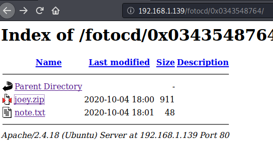 note.txt gives us the password to unzip joey.zip. Download joey.zip and unzip it with the command unzip joey.zip and the password #9175.