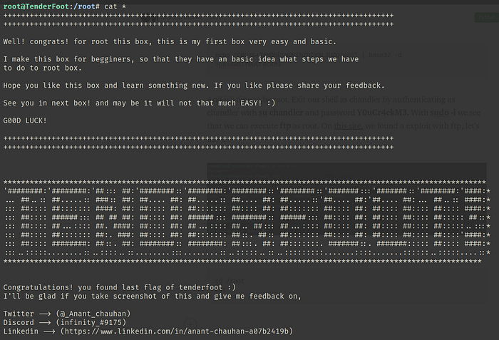 >passwd:Y0uCr4ckM3And it’s time to be root. Exit our shell as chandler by authenticating as chandler with su chandler and password Y0uCr4ckM3. With sudo -l we see that we can execute ftp as root. On this site, we found a exploit with ftp, let’s use it :