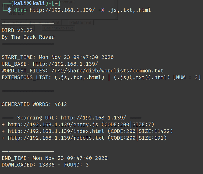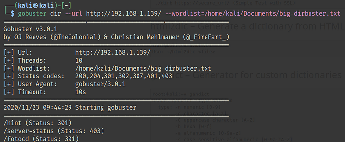 gobuster dir --url http://<IP>/ --wordlist=/home/kali/Documents/big-dirbuster.txt -x js,php,txt,html,/ -t 100Press enter or click to view image in full size