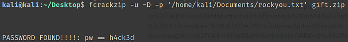 Now wee need to crack gift.zip, we are going to use frackzip with the rockyou.txt list.