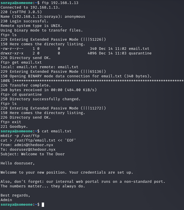 We start with the ftp server enumeration, and we find an email.txt file as well as an empty quarantine directory :