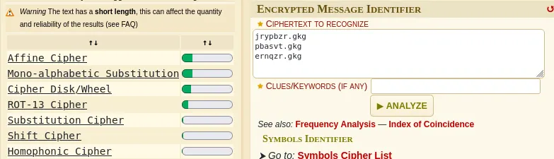 a quick cipher identifier tool found a potential ROT13 encryption: