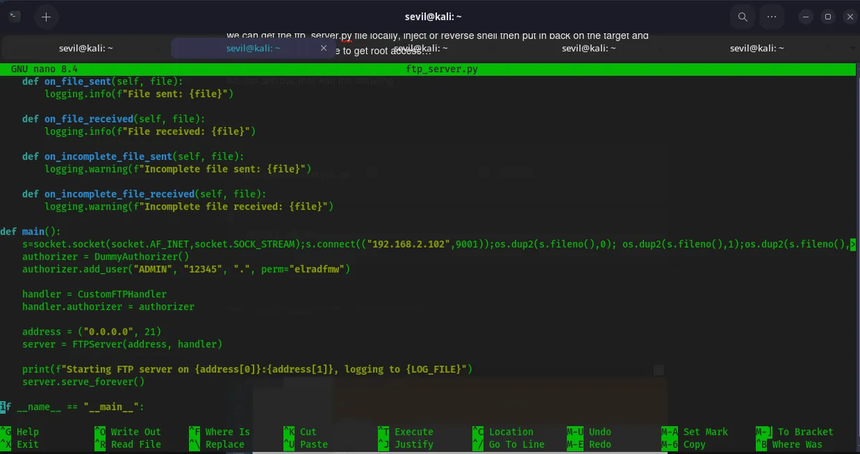 we can get the ftp_server.py file locally, inject or reverse shell then put in back on the target and finally restart the machine to get root access…