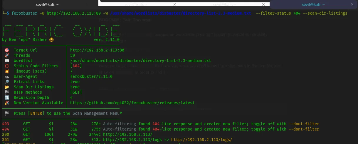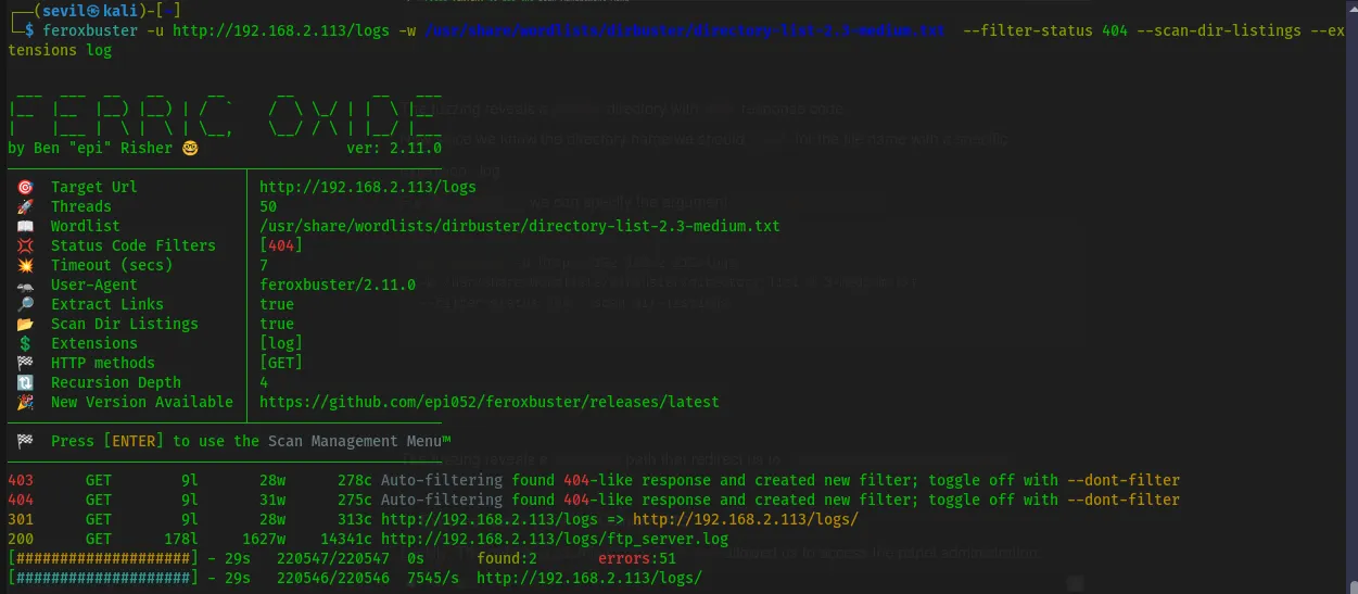 :feroxbuster -u http://192.168.2.113/logs