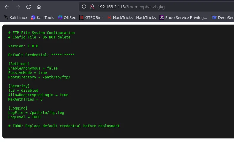 The page gave us valuable information about the FTP server running such as the FTP using Default credential, and server contains a FTP log file (Could be our target file to find)