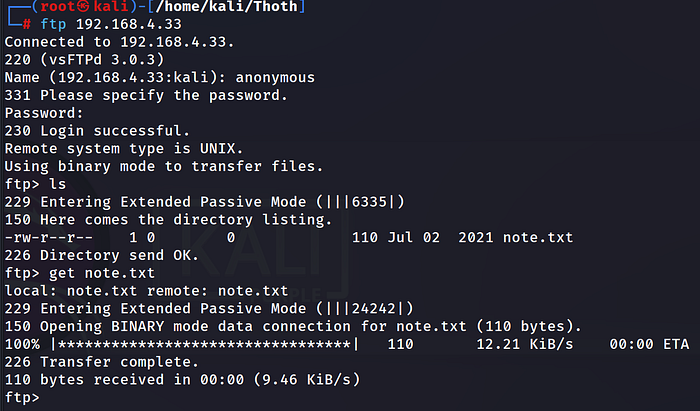 We have 3 open ports. I decided to go with the ftp server first. Since there is a note.txt for us as shown on the image above.