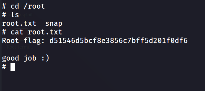 We have a rootshell. Last step is to get the root flag in the root directory