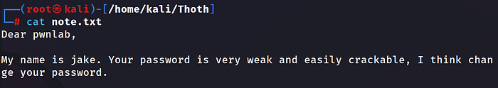 get note.txtWhich downloads the file on our attacker machine. We then, cat out the file.