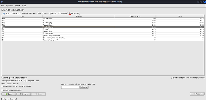 Visiting the IP address in my browser wasn’t useful that much. I also visited the profile page, it also wasn’t helpful. So I started to do some directory listing for discovering other webpages. For directory listing, I used OWASP DirBuster, which is a GUI tool.