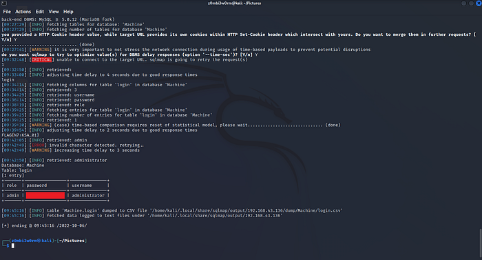 Again I used Sqlmap tool to dump tables in Machine database and the command I used were,