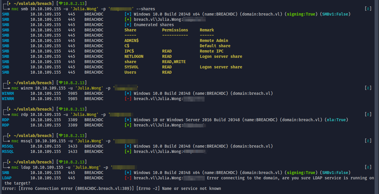 SMB 10.10.125.15 445 BREACHDC [-] breach.vl\julia.wong:julia.wong STATUS_LOGON_FAILURE