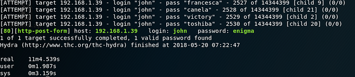 Using THC Hydra a password brute forcing tool, we were able to obtain john’s password. The following hydra command was used to do so:
