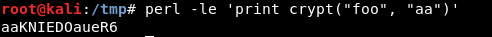 So to append a new user with id as 0(userid 0 has root privileges), we need to provide a valid password hash in second column. Crypt function in Perl can be used to create password hashes in the compatible format. Crypt function takes the password and its salt as the arguments and returns a single password hash.