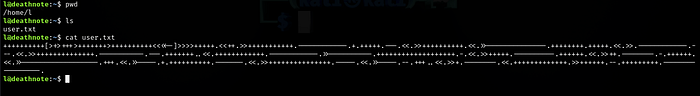 We are in, logged in as the user L. Right out of the gate there’s a user.txt file in L’s directory. It’s a coded message, the language used is brainfuck an esoteric programming language.