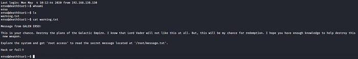 So we go further trying to ssh. But as the access we find is for a normal user named erso. We have to disconnect and try that. Here, the catch is that there is a hint for the password : “My wife’s first name plus the year (BBY) she died.”
