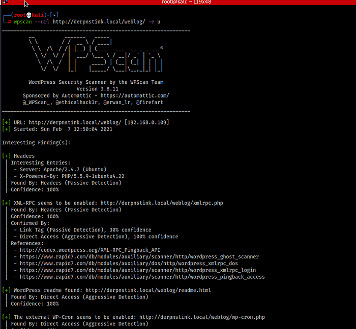 wpscan — url http://derpnstink.local/weblog/ -e uPress enter or click to view image in full size