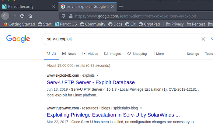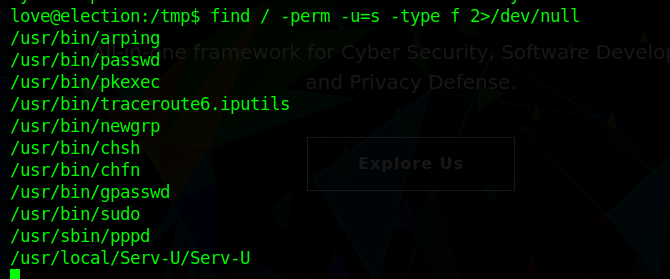 Before running a script, I generally try to look for quick wins. So I ran a check for suids. I found an unusual one by the name Serv-U:-