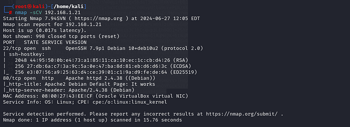 The scan reveals two open ports: port 80 (HTTP) and port 22 (SSH).