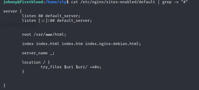 johnny@firstblood:/$ cat /etc/nginx/sites-enabled/default | grep -v “#”