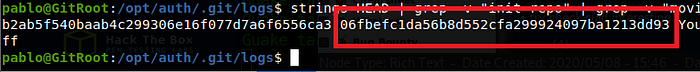 We will take a look at /opt/auth/.git. Inside that directory, we found that there is a lot of branch using git branch. So we can look at the log and see if there is something important for us. Since there are a lot of repeating words I use this command inside the log directory.