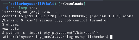 Use python command:python -c ‘import pty;pty.spawn(“/bin/bash”)’ to upgrade the shell.