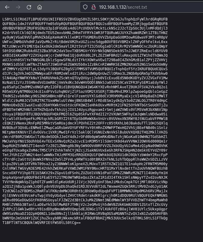 Visiting the /secret.txt we have some kind of encrypted text, looking at the == at list, I can assume this is base64 encoded