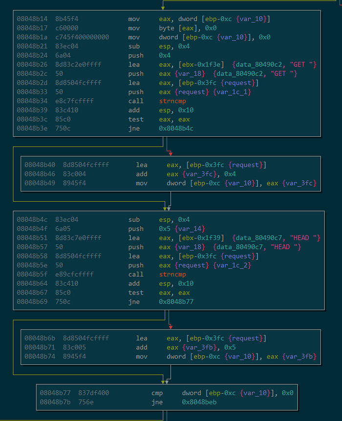 If we read further into the code, we’ll see a few useful functions: 0x8048aad handles the requests, 0x804895b sends data, and 0x80489c0 receives data.