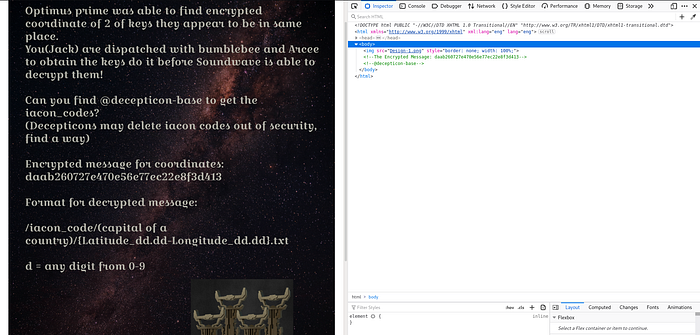 Try to crack the hash. But no use It takes much time or not working. So Move to get any other hints.The \@decepticon-base looks like Username. Try to find out the Username Everywhere. Check it using google dorks but no use. So use any other tools to find it out. I used sherlock and I found the github username with decepticon-base
