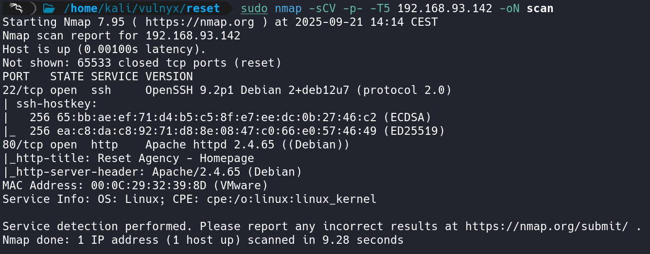 Once we have the IP address of the Reset machine, we scan to see which ports are open: