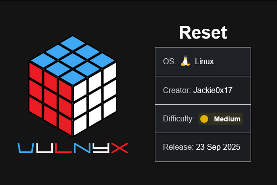 Hello and welcome to the solution of the Medium difficulty machine - Reset from the VulNyx platform . I put a lot of care into this machine, applying what I'm learning in the CWEE HTB certification. I hope you enjoy it.