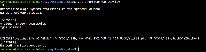 Then, I modified shuriken-job.service file, firstly, it will make dir .ssh/ in /root if it doesn’t exists, while if it does then it will download id_rsa.pub from my webserver and output it into .ssh/authorized_keys. I had already setup my python3 webserver.
