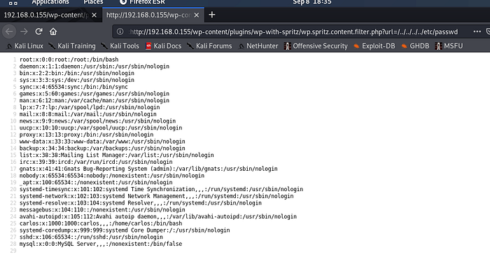This will report that only the “admin” user exists and one plug-in is installed: wp-with-spritz; Searching for it on exploit-db will show one RFI exploit:
