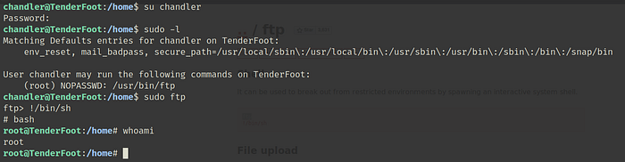 >passwd:Y0uCr4ckM3And it’s time to be root. Exit our shell as chandler by authenticating as chandler with su chandler and password Y0uCr4ckM3. With sudo -l we see that we can execute ftp as root. On this site, we found a exploit with ftp, let’s use it :