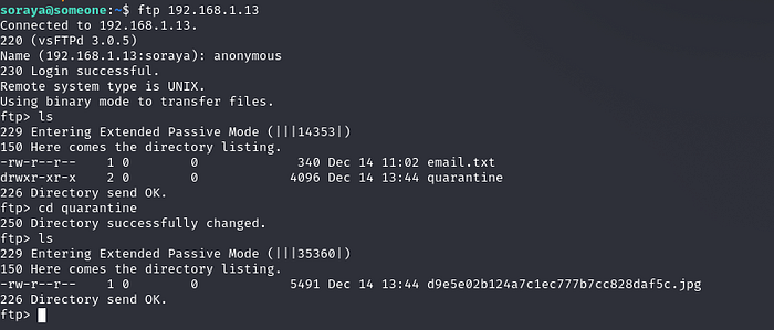 We start with the ftp server enumeration, and we find an email.txt file as well as an empty quarantine directory :
