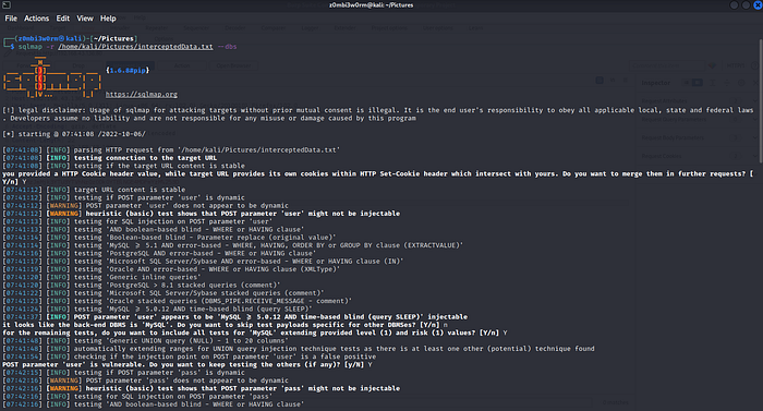 sqlmap -r /home/kali/Pictures/interceptedData.txt -- dbs